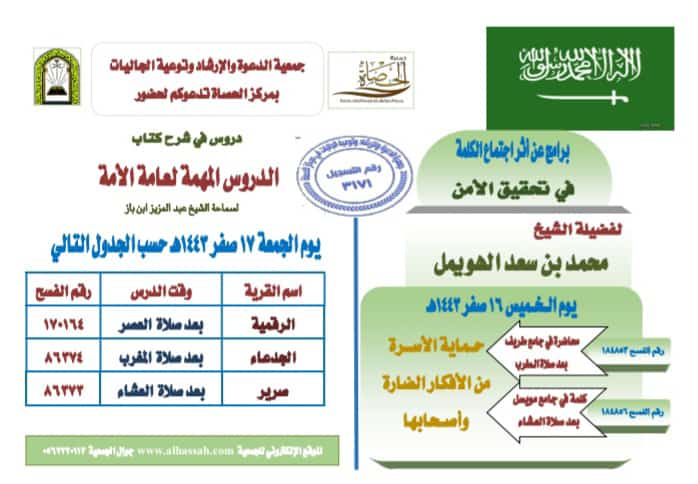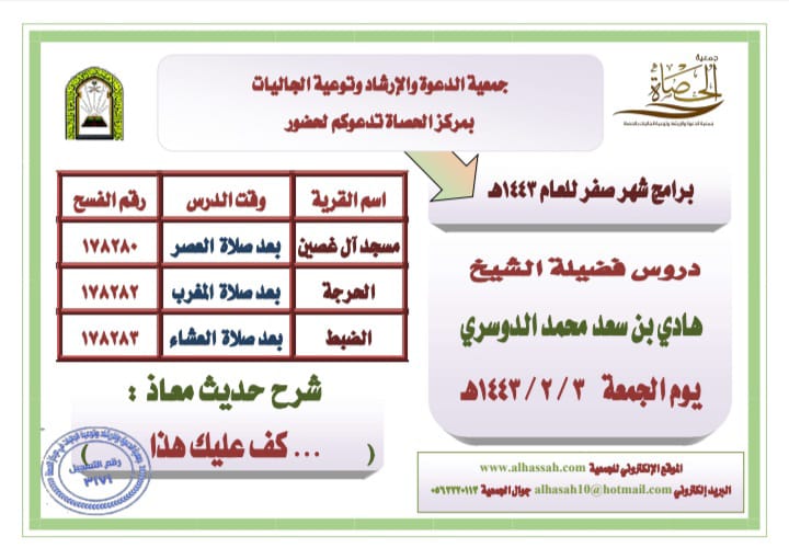 ألقى الشيخ هادي الدوسري يوم الجمعة 3 صفر 1443هـ ثلاث دروس في ( مسجد آل غصين ، هجرة الحرجة ، هجرة الضبط ) ضمن الدروس التي نظمتها جمعية الدعوة بالحصاة في شهر صفر للعام 1443هـ