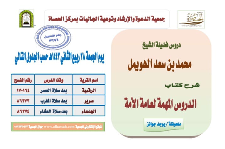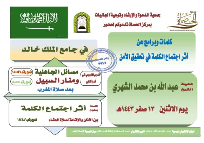 دعوة لحضور درس فضيلة الشيخ عبد الله الشهري شرح كتابي مسائل الجاهلية ومنار السبيل في جامع الملك خالد الاثنين ٢٩ محرم ١٤٤٣ بعد صلاة المغرب