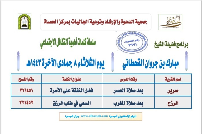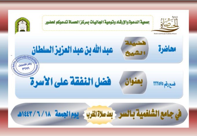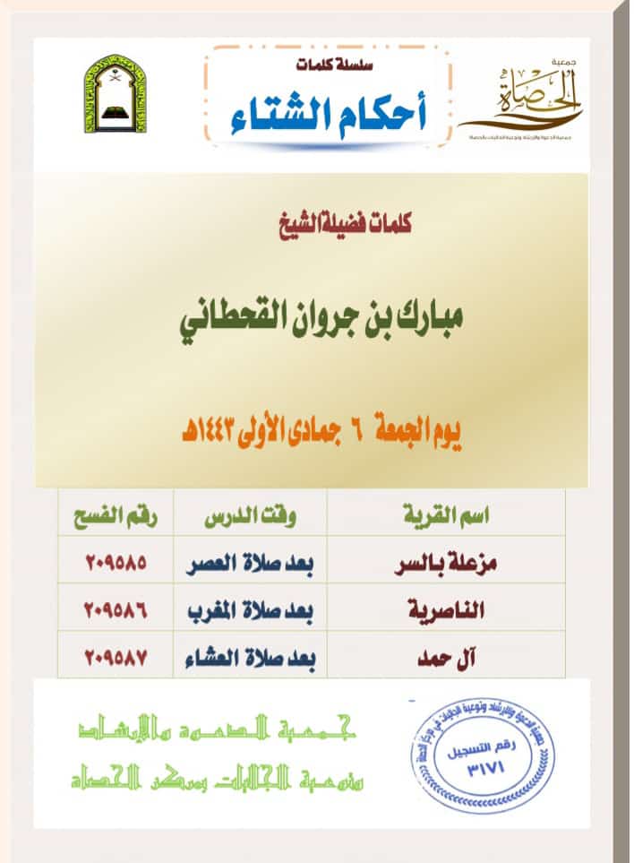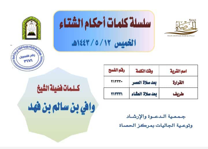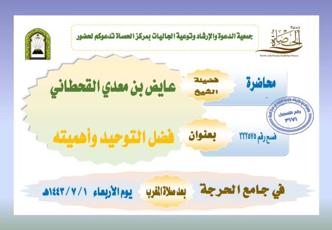 دعوة لحضور محاضرة فضيلة الشيخ عايض بن معدي القحطاني في هجرة الحرجة يوم الأربعاء 1 رجب 1443هـ