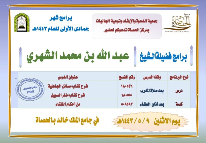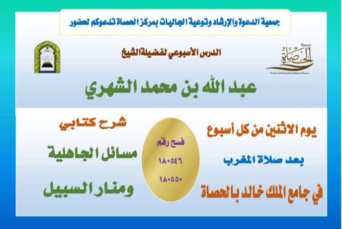 الدرس الأسبوعي لفضيلة الشيخ عبد الله بن محمد الشهري