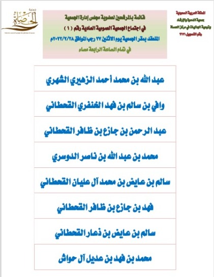 قائمة أسماء المرشحين لمجلس إدارة جمعية الدعوة والإرشاد وتوعية الجاليات بمركز الحصاة في دورته الجديدة ، الموافق عليهم من قبل وزارة الموارد البشرية والتنمية الاجتماعية