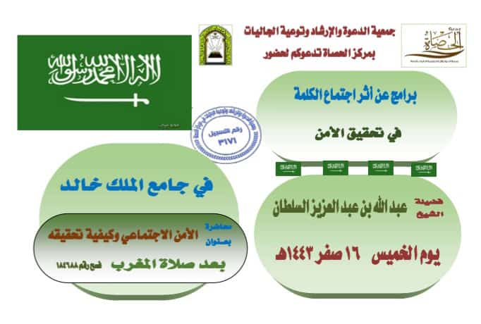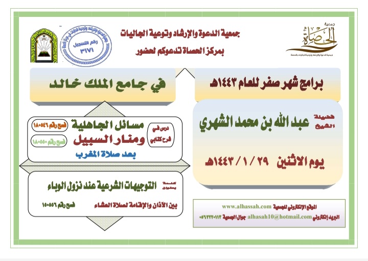دعوة لحضور درس فضيلة الشيخ عبد الله الشهري شرح كتابي مسائل الجاهلية ومنار السبيل في جامع الملك خالد الاثنين ٢٩ محرم ١٤٤٣ بعد صلاة المغرب