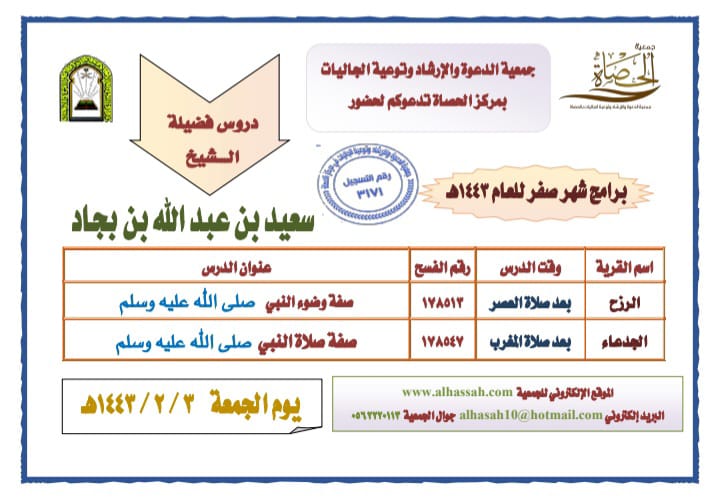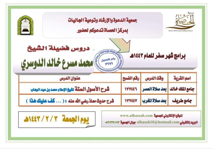 ألقى الشيخ محمد بن مسرع الدوسري درسين نسقت لهما جمعية الدعوة بالحصاة في جامع الملك خالد وفي هجرة طريق وذلك يوم الجمعة 3 صفر 1443هـ نسأل الله أن يتقبل من الجميع جهودهم
