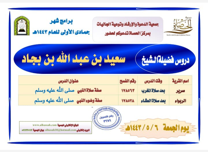 ألقى الشيخ هادي الدوسري يوم الجمعة 3 صفر 1443هـ ثلاث دروس في ( مسجد آل غصين ، هجرة الحرجة ، هجرة الضبط ) ضمن الدروس التي نظمتها جمعية الدعوة بالحصاة في شهر صفر للعام 1443هـ